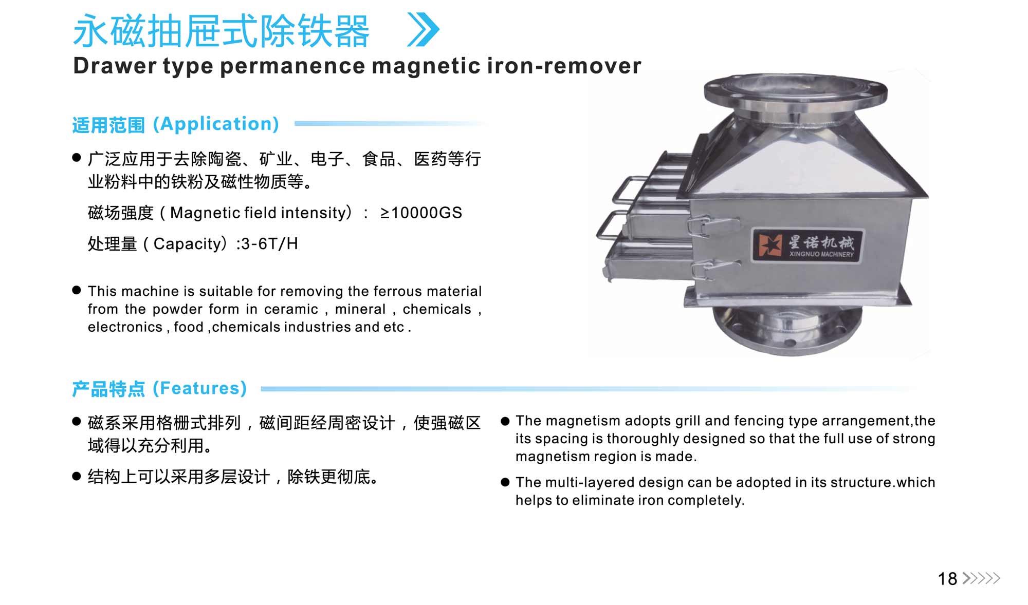 ·The magnetism adopts grill and fencing type arrangement,the its spacing is thoroughly designed so that the full use of strong magnetism region is made. ·The multi-layered design can be adopted in its structure.which helps to eliminate iron completely. |